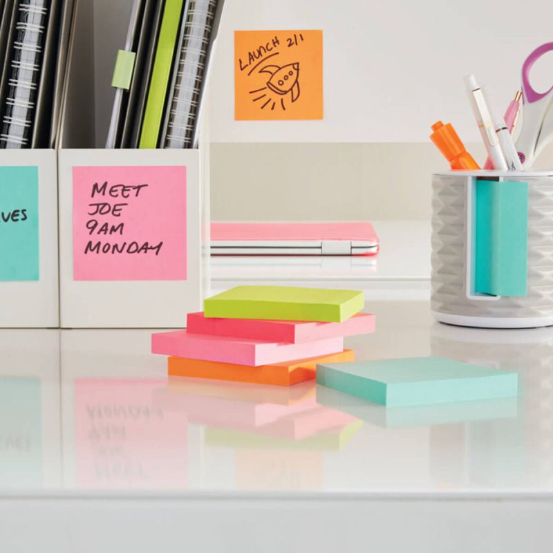 Samolepilni lističi z barvnimi listi, dimenzije 76x76mm, v 450 listni kocki. Primerni za zapisovanje kratkih sporočil.