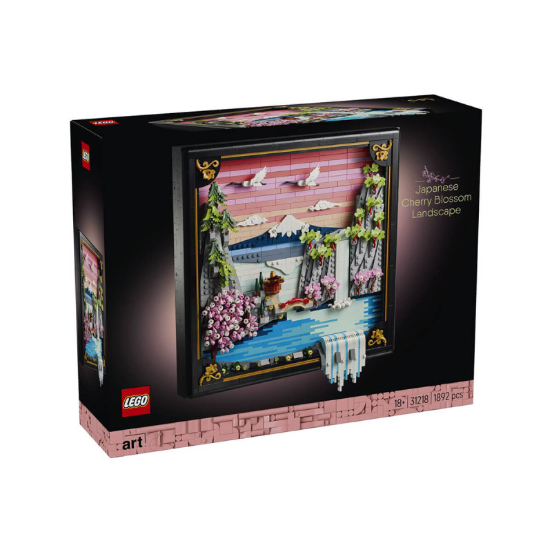 Lego® Art 31218 Pokrajina s cvetočimi japonskimi češnjami S kompletom za sestavljanje LEGO Umetnost Pokrajina s cvetočimi japonskimi češnjami v svoj dom vnesi barvo in naravo. Osupljivi 3D-okras iz kock je navdahnila lepota japonske pomladi in prikazuje goro Fuji s čajnico, mostom, slapom, japonskimi žerjavi v letu ter cvetočimi češnjami, pahljačastim javorjem in japonskimi dežnikastimi bori. Z vgrajenim nosilcem se lahko obesi na steno, lahko pa prosto stoji na vodoravni površini. Slap na umetnini teče čez okvir in se v viseči različici konča v zraku, ko okvir razstavimo na vodoravni površini, pa je mogoče konec vode prilagoditi, da se razliva vodoravno. Model je ideja za darilo z japonskim navdihom za ljubitelje umetnosti in vključuje navodila, ki te bodo vodila skozi ustvarjalno dejavnost. Primerno za otroke stare 16 let +.
