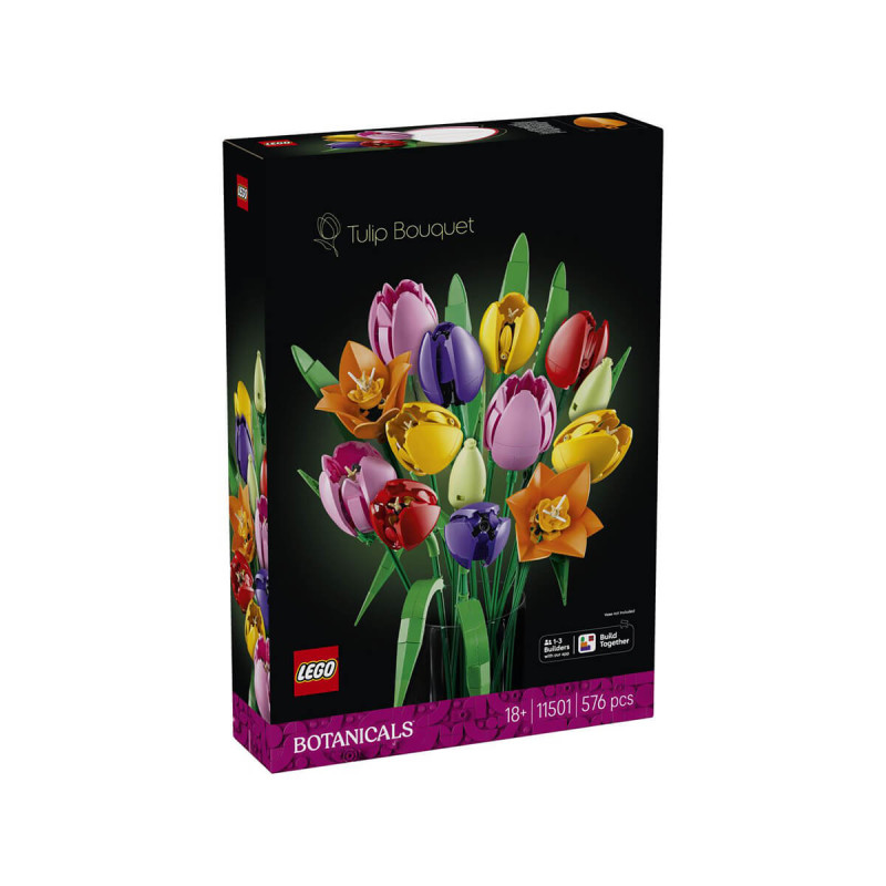 LEGO® Botanicals 11501 Šopek tulipanov Dodaj čudovit cvetlični okras svojemu domu s kompletom za sestavljanje LEGO Botanicals Šopek tulipanov. LEGO šopek ujame veselje in optimizem pomladi. Prinaša 5 vrst tulipanov v različnih barvah in stopnjah cvetenja. Zatopi se v lepoto cvetja med ustvarjanjem živahnih zelenih popkov, vijoličnih zaprtih tulipanov in rdečih, rumenih in rožnatih odprtih tulipanov, skupaj z zelenimi listi, tako da so videti še bolj resnični. V kompletu za sestavljanje cvetja so tudi nastavljiva stebla, ki omogočajo enostavno razporeditev tulipanov v edinstven LEGO šopek. Komplet za sestavljanje cvetja je pozorno darilo ob rojstnih dnevih, valentinovem, materinskem dnevu, vselitvah ali drugih posebnih priložnostih. Primerno za otroke stare 16 let +.