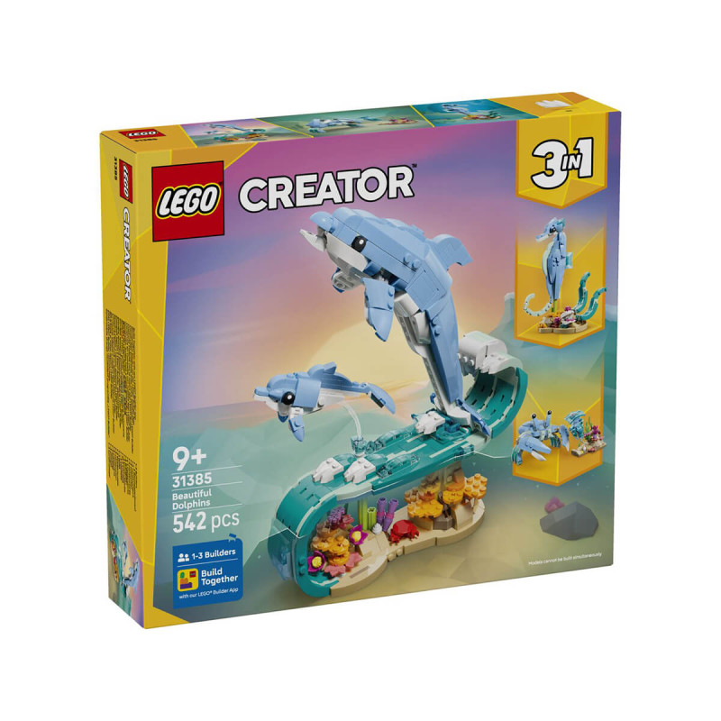 Lego® Creator 31385 Morske živali: Čudoviti delfini Komplet za sestavljanje omogoča otrokom izmišljanje zabavnih zgodbic. Morska živalska igrača za dekleta in fante ponuja 3 različne možnosti sestavljanja z istim kompletom kock. Lahko se odločijo za sestavljanje dinamičnega modela z odraslim delfinom in mladičkom z nastavljivimi deli teles, ki drsita po visokem valu nad koralami. Nato lahko sestavijo nastavljivega morskega konjička na pisanem stojalu z morsko travo in školjko, ali pa rakovico ob morskih rastlinah in meduzi. Ko je igre konec, je lahko vsak od treh prelepih modelov razstavni okrasni kos na polici ali mizi. Otroci lahko vsak igralni komplet samozavestno sestavijo z aplikacijo LEGO Builder, ki s preprostimi digitalnimi navodili omogoča povečevanje, vrtenje v 3D-pogledu in sledenje napredku. Opozorilo: ni mogoče sestaviti vseh modelov hkrati. V kompletu je 542 koščkov. Primerno za otroke stare 8 let +.