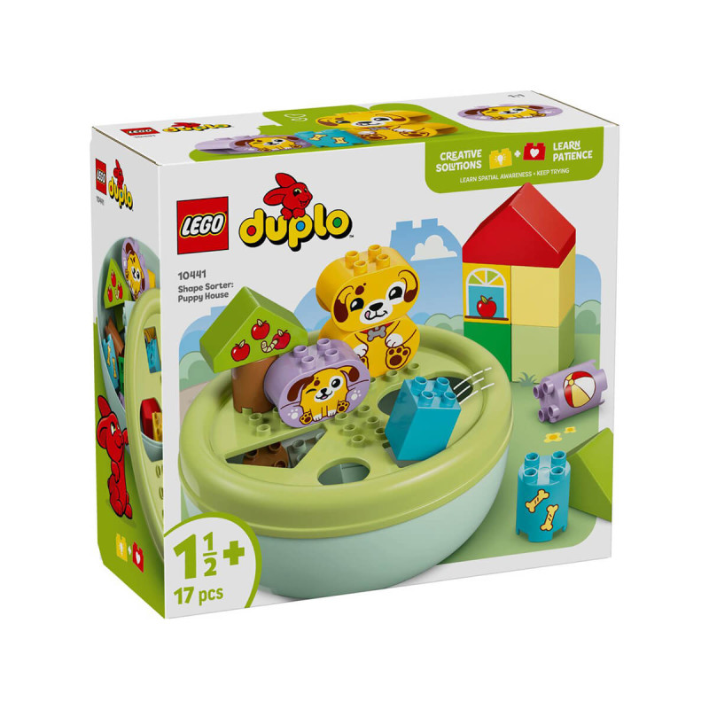 Lego® Duplo® 10441 Razvrščanje oblik: Psičkova uta Dvigni pokrov in odkrij kup igre razvrščanja s psičkom. Predšolski otroci sestavijo prostor za igro pod drevesi, nato pa mladičkom vržejo žogo, da jo bodo lovili, ali jih nahranijo s kostjo. Malčki se lahko zabavajo in se učijo, medtem ko spuščajooblike skozi luknje v pokrovu, ki se trdno pripne na skledo, da lahko pospravijo svoje kocke, ko je igre konec.