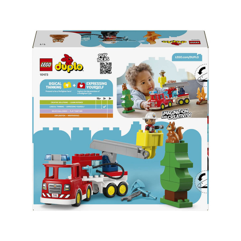 Lego® Duplo® 10473 Gasilsko vozilo s cevjo in gasilcem Spodbujaj zabavno igro pretvarjanja reševanja za malčke z igračo reševalnega vozila Lego® Duplo® Town Gasilsko vozilo s cevjo in gasilcem (10473). Gasilsko vozilo ima veliko podrobnosti, kot je gibka cev, drevo in figura veverice. Izobraževalna igrača lahko pomaga malčkom razviti predšolske spretnosti. Spodbuja razvoj čustvene inteligence in empatije, saj otroci razvijajo empatijo, ko si predstavljajo, kaj pomeni biti pogumen gasilec, ki pomaga drugim. Model gasilskega tovornjaka je poln zabavnih podrobnosti za spodbujanje ustvarjalnih zgodb o reševanju. Opremljen je z lestvijo na tečajih in prozornim vodnim rezervoarjem iz kock. Nadobudni gasilci se lahko pretvarjajo, da pritrdijo cev in pogasijo ogenj. Med igro malčki razvijajo tudi finomotorične spretnosti, saj lahko gasilski tovornjak preoblikujejo tako, da njegova prikolica postane členjena in tako omogoča lažjo vožnjo v ovinkih. Primerno za otroke stare 2 leti +.