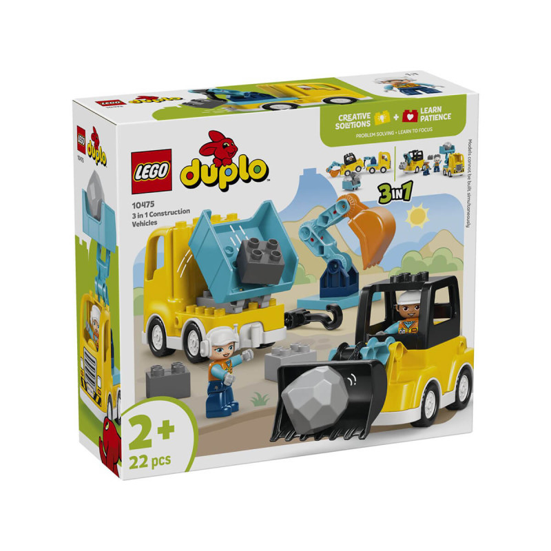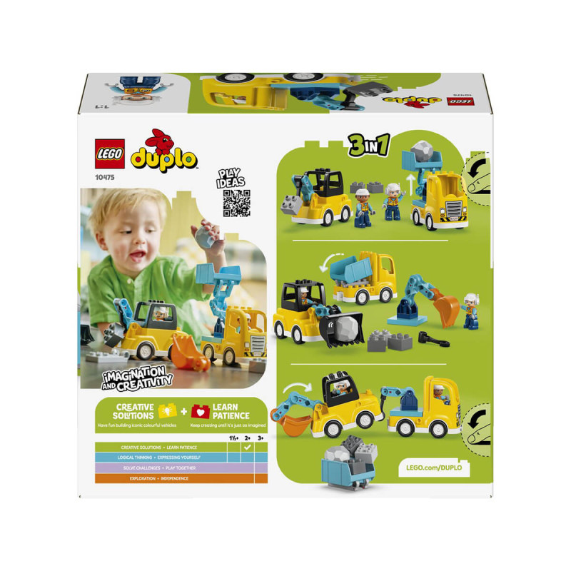 Lego® Duplo® 10475 3v1 Gradbena vozila Spodbudi ustvarjalnost svojega malčka z darilom Lego® Duplo® Town 3v1 Gradbena vozila (10475). Igralni čas je poln zabave pri sestavljanju, saj malčki s svojo pozornostjo ustvarijo 6 različnih možnosti za sestavljanje tovornjakov. Gradbeni komplet Lego® Duplo® z 22 kockami omogoča izdelavo 3 parov tovornjakov: nakladalnik s prekucno žlico, ki nalaga kocke v smetarsko vozilo, rovokopač in vlečno vozilo z vrtljivo roko, ali pa škarjasto dvigalo in drugo vlečno vozilo z majhno kljuko za dviganje kock. Spodbujaj majhne sestavljalce, da z uporabo ustvarjalnosti, reševanja problemov, vztrajnosti in finomotoričnih spretnosti raziskujejo različne rešitve ter ustvarjajo inovativne tovornjake. Komplet vključuje tudi dve figuri graditeljev, ki jih malčki lahko uporabljajo za vožnjo in upravljanje vozil. Primerno za otroke stare 2 leti +.