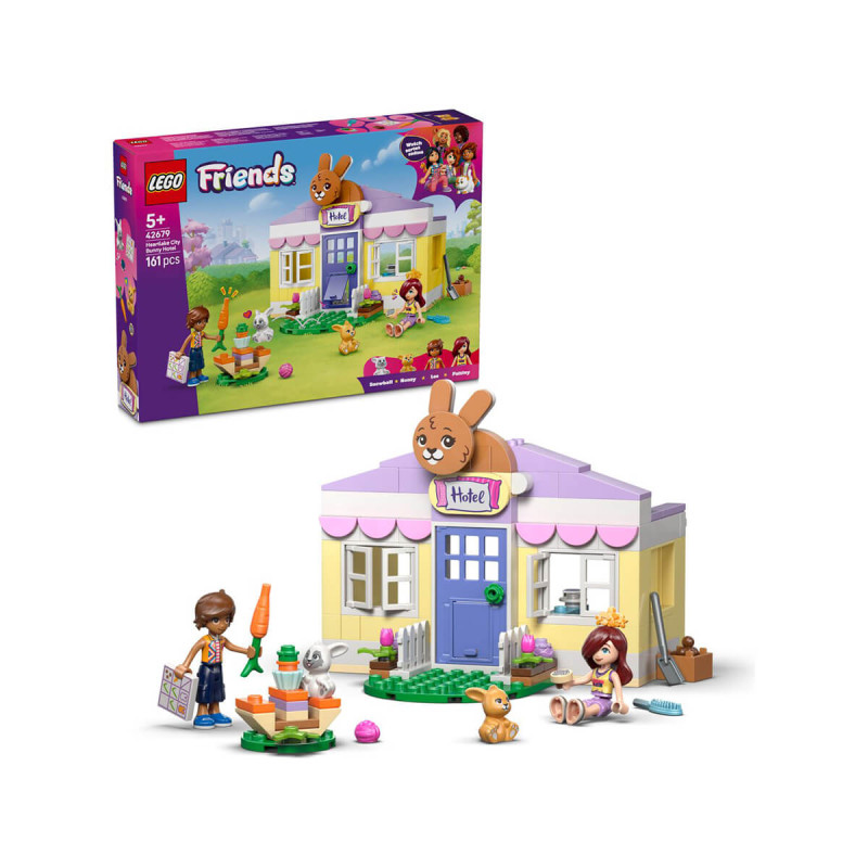 Lego® Friends 42679 Hotel za zajčke v Heartlake Cityju Z LEGO Friends Hotelom za zajčke v Heartlake Cityju skoči v domišljijske zgodbe. Igrača za igro pretvarjanja vsebuje 2 minifiguri in 2 zajčka za pripovedovanje zgodb o skrbi za živali. Ljubek komplet je poln zabavnih podrobnosti, kot so posebna vrata in prikupen znak za zajčke. V notranjosti je preproga v obliki korenčka, spalni prostor z zajčjimi posteljami ter seznam za preverjanje vstopa in izstopa zajčkov iz hotela. Zunaj je sedežni prostor za zajčke, kjer lahko skupaj sedijo in uživajo v korenčkovem kolačku. Drugi dodatki otroke spodbujajo k skrbi za hišne ljubljenčke, saj vsebujejo krtačo, klobčič preje, hrano in vodo za zajčke ter lopato za pobiranje zajčjih kakcev. Z aplikacijo LEGO Builder omogočite otroku enostavno in intuitivno gradbeno pustolovščino. Tu lahko otroci povečajo in vrtijo modele v 3D-pogledu, shranjujejo komplete in sledijo napredku. V kompletu je 161 koščkov. Primerno za otroke stare 5 let +.