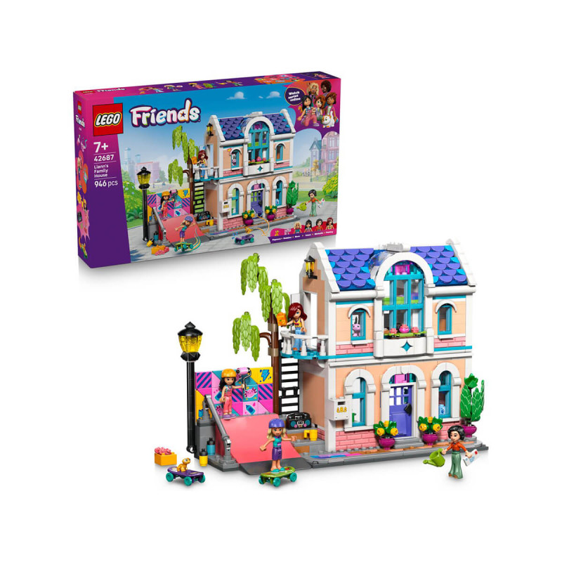LEGO® Friends 42687 Liannova družinska hiša Dobrodošli v Liannovi družinski hiši (42687), kjer lahko otroci uprizarjajo svoje zgodbe. Otroci lahko raziskujejo čudovito LEGO hišo s kuhinjo, dnevnim prostorom, spalnico, balkonom in vrtom. Preizkusijo se lahko v različnih spretnostih, saj Liann in njeni prijatelji uživajo v rolkanju, umetnosti ter skrbijo za gekona in aksolotla. Podrobno izdelana igrača vsebuje 4 minifigure in številne dodatke, vključno z rolkami, slikarskimi potrebščinami, glasbenim stolpom, pisalno mizo, terariji in še veliko več. Na voljo so tudi prikupni dodatki za hrano, kot so jedilne paličice, škatle za rezance, sojina omaka, mleko in pomarančni sok. Otroci se lahko preizkusijo tudi v oblikovanju in s pomočjo odstranljivih ploščic prilagodijo barvito stensko poslikavo. Komplet je ustvarjalno darilo za otroke, ki se radi igrajo s hišicami. Z aplikacijo LEGO Builder omogočite otroku enostavno in intuitivno gradbeno pustolovščino. Tu lahko otroci povečajo in vrtijo modele v 3D-pogledu, shranjujejo komplete in sledijo napredku. V kompletu je 946 koščkov. Primerno za otroke stare 7 let +.
