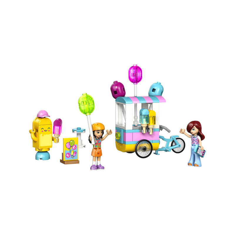 LEGO® Friends 42692 Stojalo s sladoledom in baloni Otroci lahko uživajo v sladkih dogodivščinah in ustvarjalnih igrah z LEGO Friends Stojalom s sladoledom in baloni (42692). Igrača za pretvarjanje vsebuje zabavne podrobnosti in prikupne dodatke, ki spodbujajo otrokovo domišljijo. Minifiguri Liann in Paisley pomagata otrokom, da se vživijo v zgodbo in postavijo stojnico za prodajo balonov in sladolednih dobrot. Liann ima čelado in je pripravljena na vožnjo s kolesom, ki vleče stojnico. Igro dodatno razširijo sladoledna maskota, jedilnik, blagajna in telefon. Na voljo je tudi miza, kjer se lahko prijatelji družijo. Komplet za igro vlog je zabavno rojstnodnevno darilo za otroke, ki se radi pretvarjajo. Z aplikacijo LEGO Builder omogočite otroku enostavno in intuitivno gradbeno pustolovščino. Tu lahko otroci povečajo in vrtijo modele v 3D-pogledu, shranjujejo komplete in sledijo napredku. V kompletu je 107 koščkov. Primerno za otroke stare 6 let +.