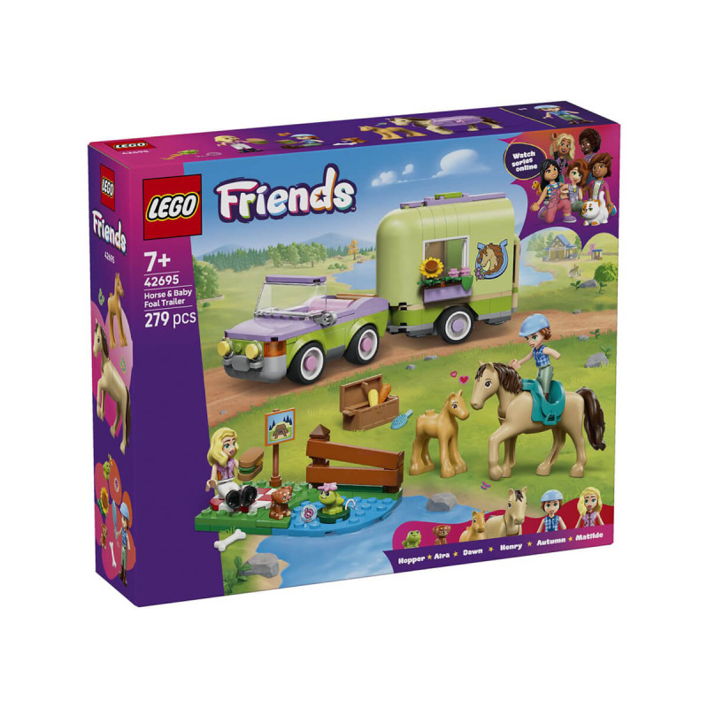 LEGO® Friends 42695 Prikolica za kobilo in žrebe Naj otroci uživajo v urah igranja vlog in skrbijo za živali z igračo za sestavljanje LEGO Friends Prikolica za kobilo in žrebe (42695). Komplet za ljubitelje konj vsebuje 2 minifiguri ter figuri konja, žrebeta, psičke in žabe. Neguj živali s pomočjo podrobnih pripomočkov za nego konj; s prikolico prevažaj konje in odjahaj čez ovire. Otroci lahko ustvarjajo zgodbe o Autumn in Matilde med vožnjo z avtomobilom. Odpri prikolico ter pozdravi konja in žrebe. Nato osedlaj konja in se pripravi na ježo. Model je opremljen z majhnim stranskim modelom s prostorom za piknik, smerokazom, jezerom in ograjo, ki jo je treba preskočiti. Komplet je odlično darilo za ljubitelje konj ali zabavno rojstnodnevno darilo za otroke, ki imajo radi živalske igralne komplete. Z aplikacijo LEGO Builder omogočite otroku enostavno in intuitivno gradbeno pustolovščino. Tu lahko otroci povečajo in vrtijo modele v 3D-pogledu, shranjujejo komplete in sledijo napredku. V kompletu je 279 koščkov. Primerno za otroke stare 7 let +.