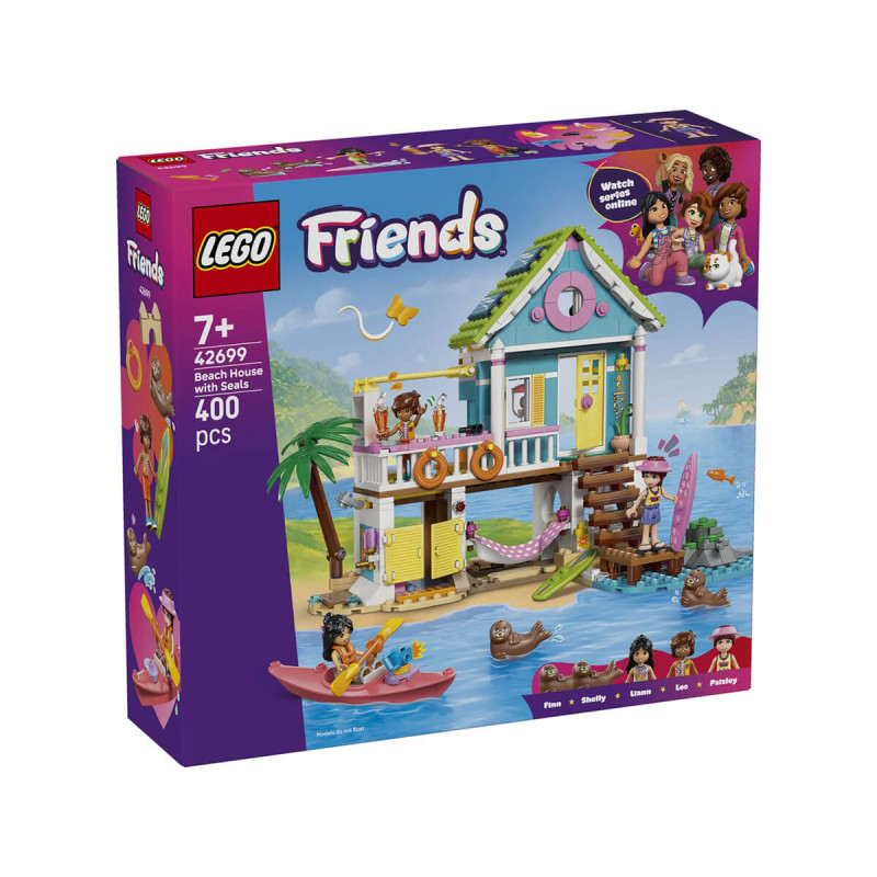LEGO® Friends 42699 Hišica na plaži s tjulnji Otroci se lahko s tem zabavnim kompletom hišice igrajo počitniške dogodivščine. Komplet za sestavljanje LEGO Friends Hišica na plaži s tjulnji (42699) vsebuje podrobno izdelano hišico na plaži, ki je polna prijetnih podrobnosti. V kuhinji je na voljo veliko pripomočkov za domišljijsko igro, vključno z aparatom za pripravo smoothiejev, spalnim prostorom s tremi posteljami ter prikupno teraso s sedeži. Zabava se nadaljuje na peščenem območju pod nebom, kjer se tjulnji radi sproščajo. Poišči zakopane zaklade! Ta podroben komplet s 3 minifigurami in 2 tjulnjema spodbuja odprto igro. Zabavni dodatki vključujejo desko za deskanje, kajak, visečo mrežo, rešilni jopič, voki-tokije, daljnogled, kremo za sončenje, fotoaparat, prigrizke in še več. Komplet je odlično darilo za rojstni dan za otroke, ki imajo radi domišljijske igre. Z aplikacijo LEGO Builder omogočite otroku enostavno in intuitivno gradbeno pustolovščino. Tu lahko otroci povečajo in vrtijo modele v 3D-pogledu, shranjujejo komplete in sledijo napredku. V kompletu je 400 koščkov. Primerno za otroke stare 7 let +.