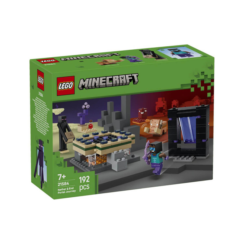 LEGO® Minecraft 21584 Potovanje skozi portala Nether in End Igralce Minecrafta prenesite v praktično igričarsko pustolovščino z igričarsko igračo Potovanje skozi portala Nether in End (21584). Otroci lahko stopijo skozi portala in raziščejo model iz vsakega bioma, nato pa se podajo na pustolovščine z minifiguro kulskega junaka ter figurama Enderman in merjaslinček. Igralni komplet LEGO Minecraft s portaloma End in Nether vsebuje funkcije za dostop do majhnih modelov za vsak biom. Avtentični dodatki, vključno z uročenim lokom in zdravilnim napojem, navdihujejo neskončne ustvarjalne pustolovščine z znanimi prizori in liki Minecraft. Komplet je odlično darilo za igralce Minecrafta, sestavljalce LEGO in ljubitelje igričarskega okrasja. Z aplikacijo LEGO Builder omogočite otroku enostavno in intuitivno gradbeno pustolovščino. Tu lahko otroci povečajo in vrtijo modele v 3D-pogledu, shranjujejo komplete in sledijo napredku. V kompletu je 192 koščkov. Primerno za otroke stare 7 let +.
