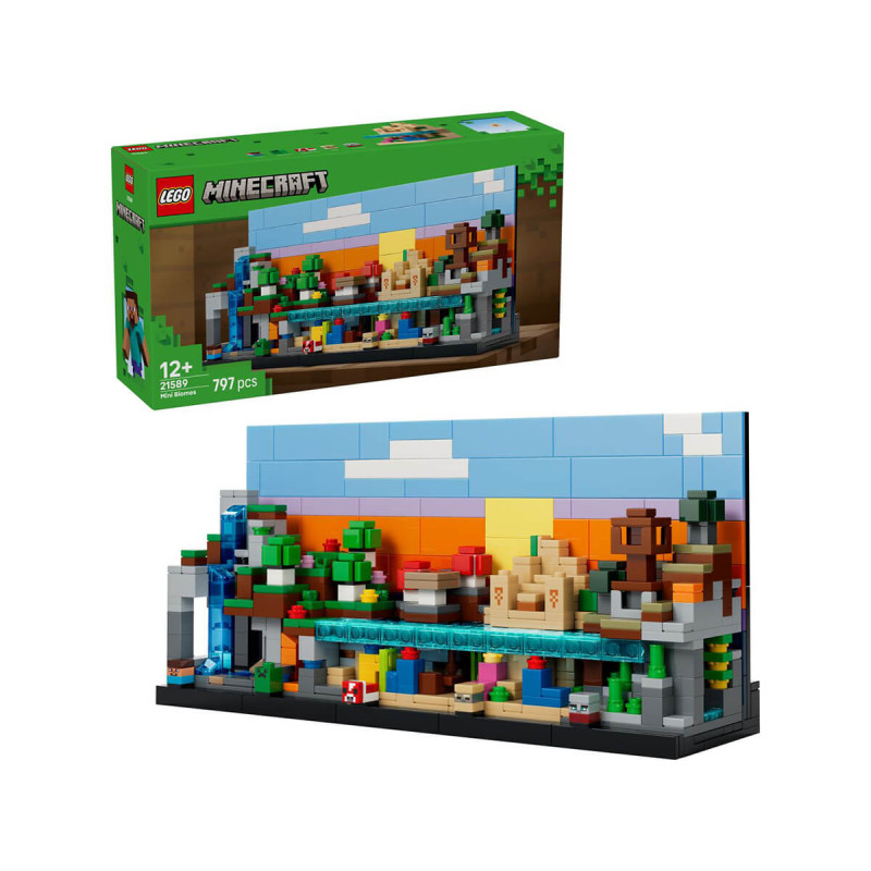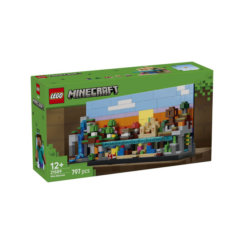 LEGO® Minecraft 21589 Mini biomi Prepoznavno okrasje Minecraft dopolni s kompletom za sestavljanje LEGO Minecraft Mini biomi (21589). Igralci Minecrafta lahko razstavijo svoje navdušenje nad igro, tako da bodo vsi občudovali 5 igričarskih biomov in 5 mikrofigur: Steve, Creeper, goba, lupinar in plenilec. V kompletu LEGO Minecraft je 5 odstranljivih biomov: gora z jamo s kapniki, geodo ametista in slapom; cvetlični gozd z jamo, lavo in zlatom; polje gob s koralnim grebenom, ladijsko razbitino, dvema rdečima gobjima drevesoma in rjavo gobo; puščava s templjem, koralnim grebenom, oceanom, kaktusi in skrinjo zakladov; ter savana s postojanko plenilcev, razkošno jamo, akacijami, bučo, lavo in plažo. Tu je tudi izmenljivo ozadje (dan/noč). Komplet je odlična ideja za igričarsko darilo za igralce Minecrafta in ljubitelje LEGO. Z aplikacijo LEGO Builder omogočite otroku enostavno in intuitivno gradbeno pustolovščino. Tu lahko otroci povečajo in vrtijo modele v 3D-pogledu, shranjujejo komplete in sledijo napredku. V kompletu je 797 koščkov. Primerno za otroke stare 12 let +.