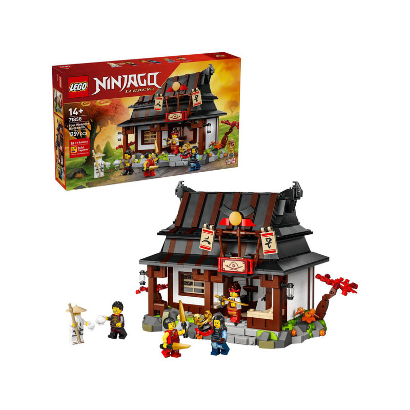 LEGO® NINJAGO 71858 15. obletnica – Kovačnica štirih orožij Fantje, dekleta in nostalgični oboževalci, stari 14+, bodo navdušeni nad kompletom za sestavljanje 15. obletnica – Kovačnica štirih orožij (71858), saj bodo lahko prvič sestavili, razstavljali in poustvarjali akcijo z ikonično kovačnico, prvo lokacijo iz pilotne epizode TV-serije LEGO NINJAGO. Ninja igračo odpri na zadnji strani, da se pokažeta spalnica in talilna peč, opremljeni s podrobnostmi in dodatki z začetkov serije. V igralnem kompletu za snemljivo čelado in oglavnico so ninja nalepke, pritisni znak in razkrije se zemljevid zlatega orožja. V kompletu je 6 minifigur likov iz zgodovine TV-serije: Maya, Ray, Nya, kovač Kai, mojster Wu ter prvič zbirateljski elementarni Mojster zemlje na stojalu. Z aplikacijo LEGO Builder omogočite otrokom enostavno in intuitivno gradbeno pustolovščino. Tu lahko povečajo in vrtijo modele v 3D-pogledu, shranjujejo komplete in sledijo napredku. V kompletu je 1.259 koščkov. Primerno za odrasle in otroke stare 14 let +.