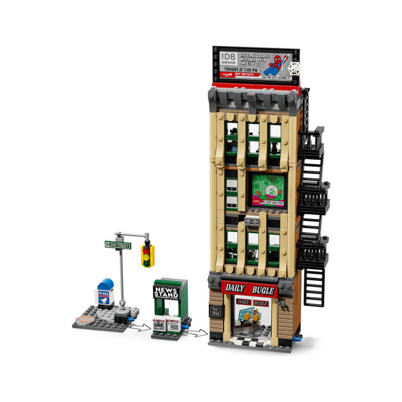 Lego® Super Heroes 76342 Spider-Man proti Mysteriu: Daily Bugle S kompletom Spider-Man proti Mysteriu: Daily Bugle, darilom s tematiko Spider-Man, razišči 4 nadstropja superjunaške akcije. Zbirateljski komplet za sestavljanje LEGO | Marvel je odličen za sestavljanje, igro in razstavo, do strehe poln minifigur in pustolovščin. V igrači za sestavljanje LEGO | Marvel Daily Bugle so minifigure Spider-Man, Miles Morales, Ghost Spider, J. Jonah Jameson, Mysterio, venomizirani stotnik Amerika in Rhino, tu pa so tudi 3 prozorne paličice in 2 prozorni kocki, ki omogočajo akcijo v zraku. Tu je tudi Rhinov členjeni robotski oklep s pilotsko kabino, ki se odpre. V podrobni notranjosti zgradbe so pisarne, sprejemnica, prostor s tehnologijo za sprejemanje novic, trezor z gotovino in delujoč oglasni pano z vzvodom za menjavo napisov. Na zunanji steni so požarne stopnice, premično stojalo za časopise in ulični vogal s semaforjem. Z aplikacijo LEGO Builder omogočite otroku enostavno in intuitivno gradbeno pustolovščino. Tu lahko otroci povečajo in vrtijo modele v 3D-pogledu, shranjujejo komplete in sledijo napredku. V kompletu za sestavljanje je 781 koščkov. Primerno za otroke stare 10 let +.