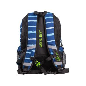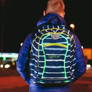 Inovativni WHEEL BEE® šolski nahrbtnik NIGHT VISION z vgrajeno LED svetilko, združuje udobje, praktičnost in varnost, kar ga postavlja v sam vrh nahrbtnikov za šolo ali druge dejavnosti. Nahrbtnik je narejen iz trpežnega materiala. Visoko kvalitetne SBS zadrge. Nahrbtnik vključuje 2 x veliki predal in 1x manjši predal. Vključuje tudi notranji organizator dodatkov ter 2 stranska žepa. Podloženo hrbtišče in podložene naramnice omogočajo udobno nošenje nahrbtnika. Na naramnicah je po višini nastavljiv prsni trak z zaponko in piščalko, na bočnem delu pa je prav tako trak z zaponko za boljše prileganje nahrbtnika. Dno nahrbtnika je iz trpežnega materiala. Nahrbtnik ima izhod za slušalke.Ena od ključnih značilnosti tega nahrbtnika so odsevni trakovi in vgrajena LED svetilka, ki predstavlja inovativno dodano vrednost za večjo vidnost in varnost otrok v prometu. Svetilka, ki je diskretno vgrajena v nahrbtnik, omogoča otrokom, da postanejo bolj opazni v pogojih zmanjšane vidljivosti, kot so zgodnje jutranje ali pozne popoldanske ure ter slabše vremenske razmere.Vgrajena LED svetilka WHEEL BEE® deluje na baterije (priložene), ki jih je enostavno zamenjati, kar omogoča dolgotrajno uporabo brez skrbi glede izpraznjene baterije. Uporabniki lahko izbirajo med različnimi svetlobnimi načini, vključno z nenehnim svetenjem, hitrim utripanjem in počasnim utripanjem. Svetilka se aktivira preko enostavnega gumba na nahrbtniku, kar omogoča otrokom, da samostojno upravljajo s prižiganjem svetilke in posledično poskrbijo za svojo varnost.Zaradi svoje inovativnosti, udobja in poudarka na varnosti v prometu, je nahrbtnik WHEEL BEE® NIGHT VISION nepogrešljiv spremljevalec vsakega otroka, ki se podaja na pot do znanja in raziskovanja sveta okoli sebe.