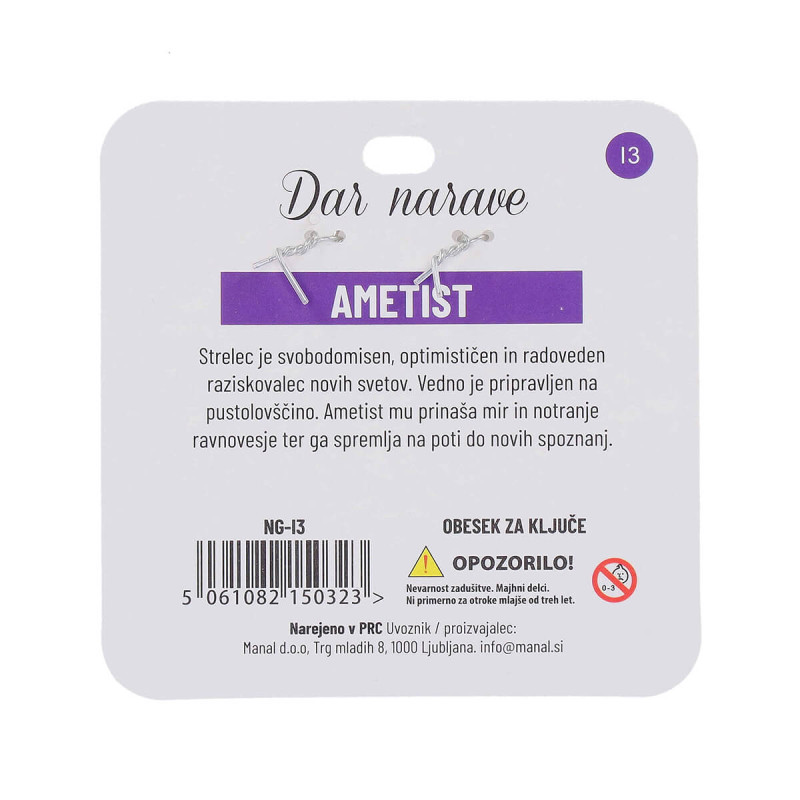 Ametist mu prinaša mir in notranje ravnovesje ter ga spremlja na poti do novih spoznanj. Opozorilo! Nevarnost zadušitve, majhni delci. Ni primerno za otroke, mlajše od 3 let.