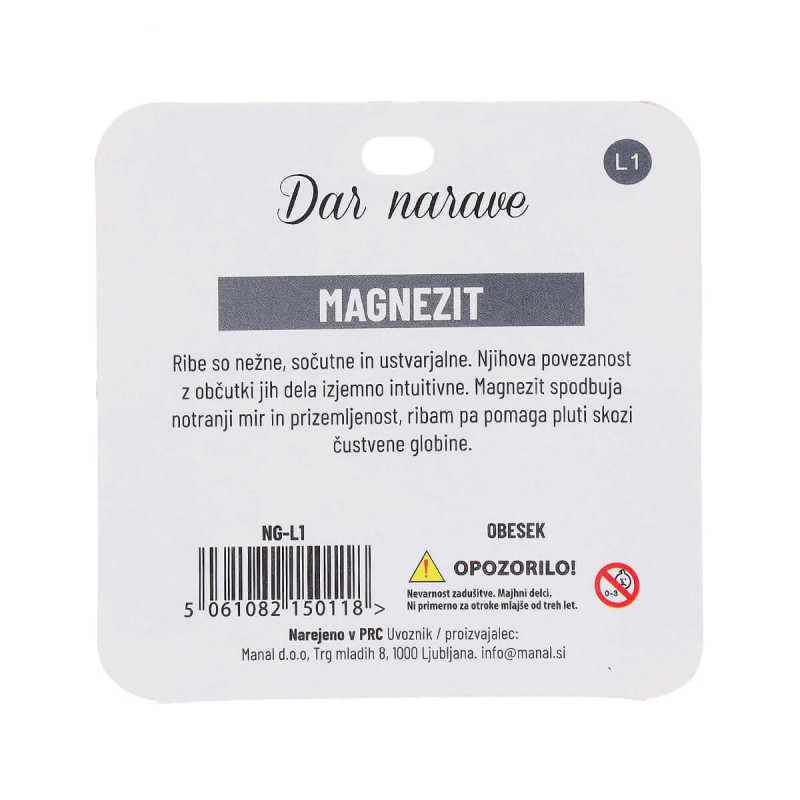 Magnezit spodbuja notranji mir in prizemljenost, ribam pa pomaga pluti skozi čustvene globine. Opozorilo! Nevarnost zadušitve, majhni delci. Ni primerno za otroke, mlajše od 3 let.
