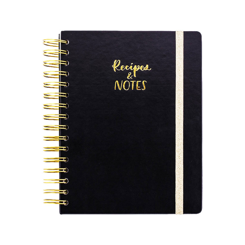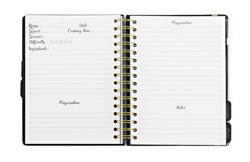 Blok, špiranli, trde črne platnice, zapiranje z elastiko v zlati barvi. V notranjosti je 6 pregrad : prigrizki, župe, solate, glavne jedi, sladice in ostalo. 80gsm papir, 120 listni, v notranjosti je žep z zadrgo